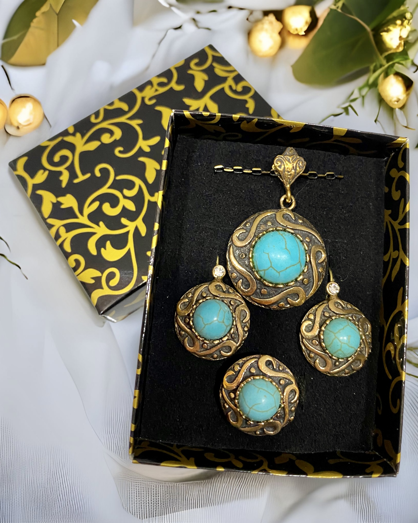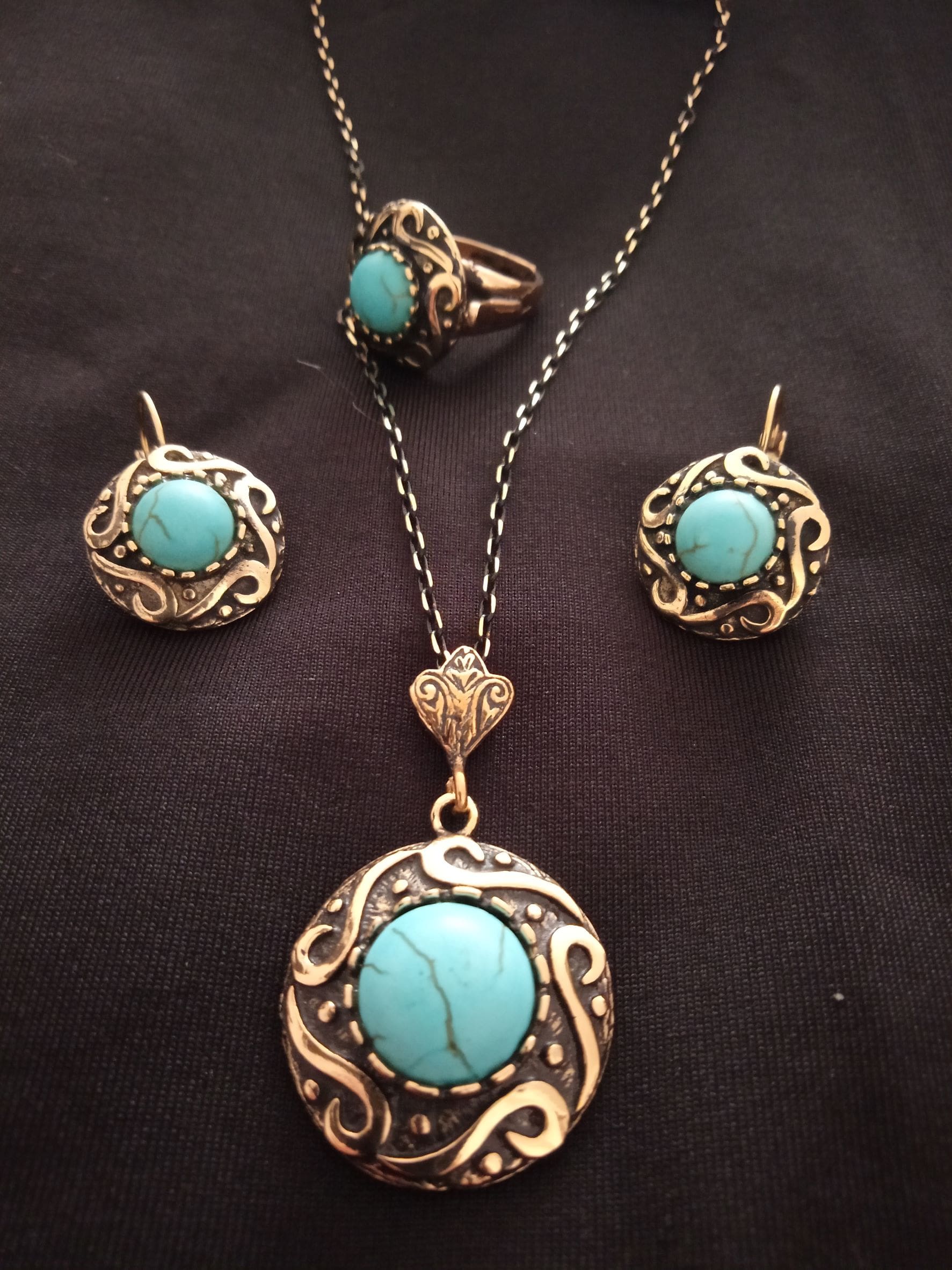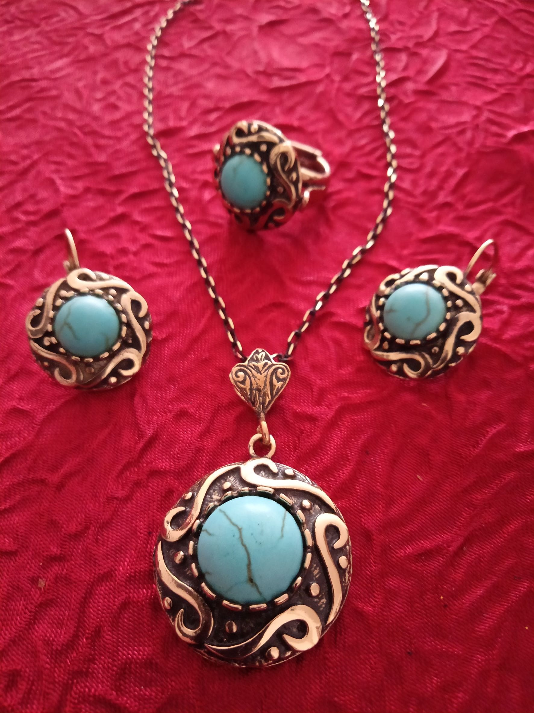 Setimiz; kolye küpe ve yüzükten oluşmaktadır. Ayrıca 42 cm uzunluğunda bakır zincir ile birlikte hediye kutusu ile gönderim yapılmaktadır.